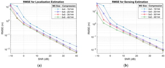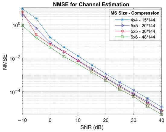 As already indicated by the size of the pilot matrix, the training duration is equal to the MS array size, , allowing the use of orthogonal training sequences of length . The use of a full orthogonal matrix is feasible due to the limited dimensionality of the UPA at the MS (e.g., 4 × 4). By employing orthogonal pilot signals, the BS can eliminate the pilot from the received signal through correlation, resulting in the dictionary matrix becoming the effective sensing matrix. In order to perform SSR, RIS phase coefficients are assigned random complex values of the form , where is kept constant during the training period or over T1 symbols. This results in a constant that does not affect the sparsity.