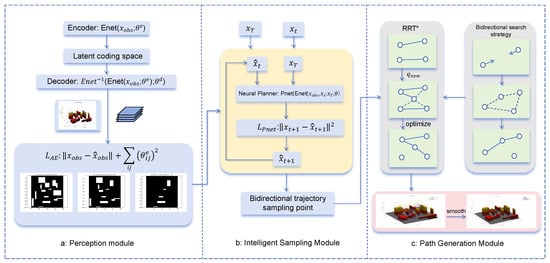 (a) The 3D map is converted to 2D for dimensionality reduction processing, then the map information is compiled into the potential space, and the obstacle information perception and feature extraction are carried out. (b) Based on the encoded map, the starting position, and target position, the optimal path is predicted. Among them, Pnet is a feedforward neural network containing multiple fully connected layers, ReLU activation layers, and dropout layers to prevent overfitting. (c) The intelligent sampling capability of MPNet is integrated into RRT* to perform bidirectional optimal path planning.