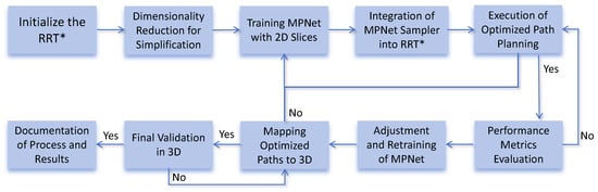 Figure 2 presents the details of a sophisticated and iterative approach for enhancing path planning in three-dimensional urban environments, leveraging the synergy between RRT* for initial path planning and MPNet for optimization. This methodology is designed to incrementally refine path planning through a series of deliberate steps, each incorporating specific validation points to ensure the quality and efficacy of the optimization process. The detailed summary below captures each step’s essence and its role within the larger optimization workflow: