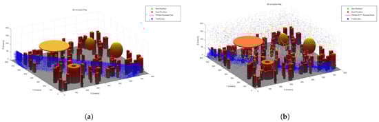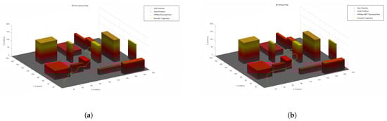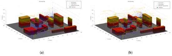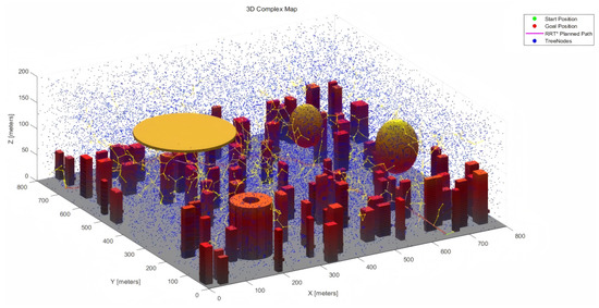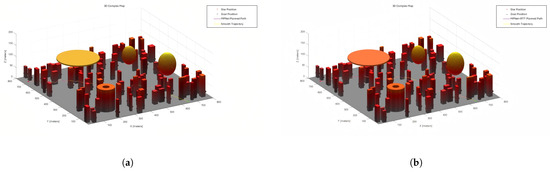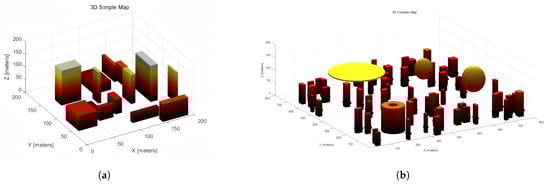 For the development of our three-dimensional maps, two unique virtual environments were designed, with dimensions of 200 × 200 × 200 and 800 × 800 × 200, respectively. These maps emulate urban scenarios tailored for unmanned aerial vehicle (UAV) motion planning tasks. The larger map features a higher density of obstacles to enhance the complexity and realism of the environment.