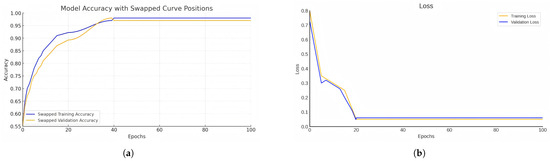 As depicted in Figure 6, the model’s training accuracy and validation accuracy both increase with the number of epochs. In the initial stages of training, the accuracy rises rapidly, reflecting the model’s capacity for swift learning. After approximately 20 epochs, both accuracies achieve high stability, with the final training accuracy nearing 100%. Notably, the validation accuracy closely tracks the training accuracy, suggesting that the model exhibits strong generalization capabilities on unseen data.