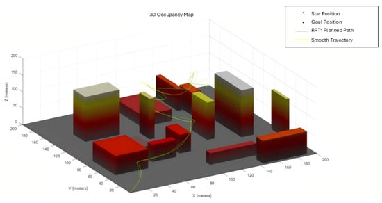 Following the completion of the final path generation, to enhance the UAV’s path planning process, it is necessary to smooth the generated path to address certain limitations of the basic RRT* algorithm. The paths generated by RRT* are often characterized by sharp edges and corners, which are not suitable for UAV navigation. This highlights the need for path smoothing, which involves optimizing the trajectory by transforming the waypoints into a smoother curve. This process aims to minimize the rate of change of jerk, or ’snap,’ which is essential for ensuring fluid UAV motion. By focusing on minimizing snap, we can ensure that the UAV’s movements are continuous and free from abrupt changes in acceleration.