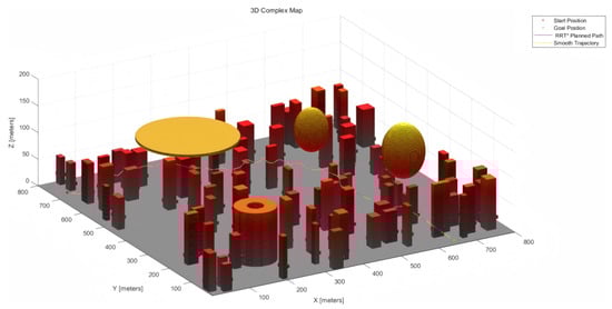 For the complex map, Table 5, which details the planning simulations on the complex map, shows that MPNet significantly outperforms the other algorithms in terms of efficiency and path optimization. The data indicate that MPNet achieves a planning time of 124.0951 s, which is considerably faster than both RRT*’s 151.9875 s and MPN-RRT*’s 142.3021 s, highlighting a more efficient planning process. In terms of path length, MPNet’s planned path of 1009.9985 m is substantially shorter than RRT*’s 1174.9542 m, demonstrating superior route optimization. The smoothness of the path, which reflects the degree of deviation, is optimal for MPNet at 5.6000, indicating a more refined trajectory compared to other methods. The flight time, a practical measure of efficiency, shows that MPNet completes the course in 336.6662 s, faster than both RRT* and MPN-RRT*, emphasizing its overall superiority in speed and directness. These findings suggest that MPNet is the most effective algorithm for scenarios requiring rapid and efficient route creation, with MPN-RRT* offering a balanced middle ground and RRT* lagging behind in performance.