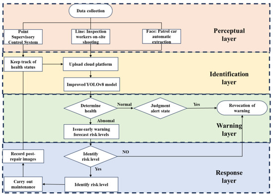 In the Warning Layer, the system evaluates the identification results. If a manhole cover is determined to be in good condition, no alert is generated. However, if it is classified as sub-healthy, an alert is triggered based on the type of defect, accompanied by a risk level assessment and preliminary maintenance suggestions derived from historical repair records, supporting informed decision-making for subsequent actions, as shown in Figure 1.