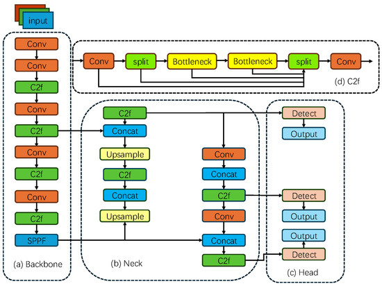 With the advancement of computer vision technology, real-time object detection [29] has found increasingly widespread applications in fields such as autonomous driving and intelligent surveillance. In 2015, Joseph Redmon and his colleagues introduced the YOLO (You Only Look Once) single-stage object detection algorithm, which transformed object detection into a regression problem [30], achieving a breakthrough in real-time detection. However, early YOLO models still exhibited limitations in detecting small objects and localization accuracy. To address these issues, researchers have continuously refined YOLO. In January 2023, to strike a balance between detection accuracy and computational efficiency in complex scenarios, Glenn Jocher and his team at Ultralytics proposed YOLOv8 [31]. This model comprises four main components, including the backbone, neck, head, and loss function, with its architecture illustrated in Figure 2.