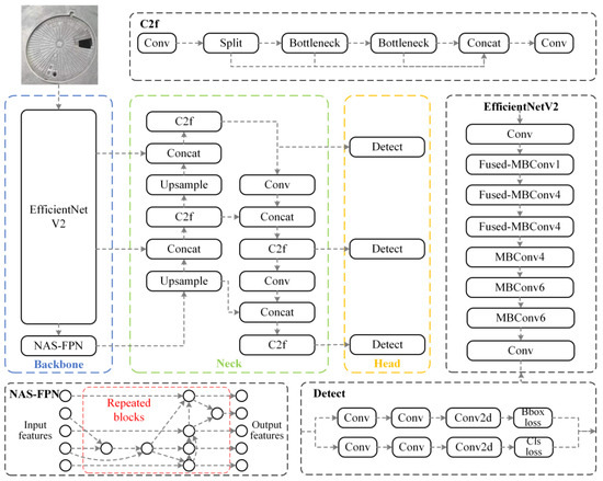 Here, the weights and are learned during training and satisfy + = 1. This dynamic weighted fusion strategy enables the model to automatically allocate the importance of features at different scales based on the specific task requirements, thereby significantly enhancing the model’s ability to capture defect features at various scales. In defect detection tasks, the model can more accurately localize and identify defect regions, reducing missed detections and false positives, and improving overall detection performance metrics such as accuracy and recall. Furthermore, the optimized network structure of NAS-FPN reduces computational complexity while maintaining performance, enhancing computational efficiency and making the model more suitable for real-time detection applications.