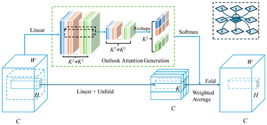 Given the presence of interfering factors in street-view images, such as ground text markings, circular traffic signs, and water stains, which can cause feature contamination during the feature extraction process, this paper introduces a foreground attention mechanism (Outlook Attention) to enhance the model’s ability to perceive and extract features of manhole cover defects. As shown in Figure 4, the network structure of the foreground attention mechanism [36] is illustrated. For an input feature map of size C × H × W × F (where C represents the number of channels, H the height, W the width, and F the feature dimensions), the foreground attention mechanism generates a foreground mask to highlight the target foreground regions. This mask is then multiplied element-wise with the input feature map, resulting in a feature map of the size C × H × W × F that incorporates foreground information.