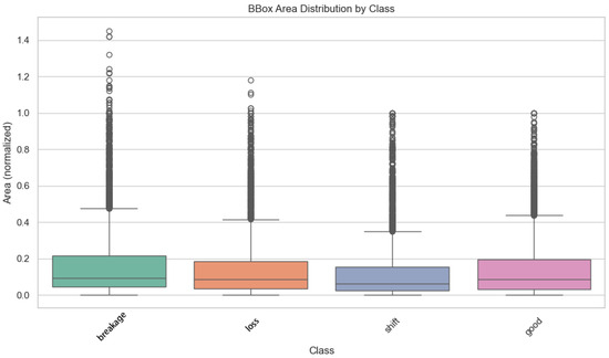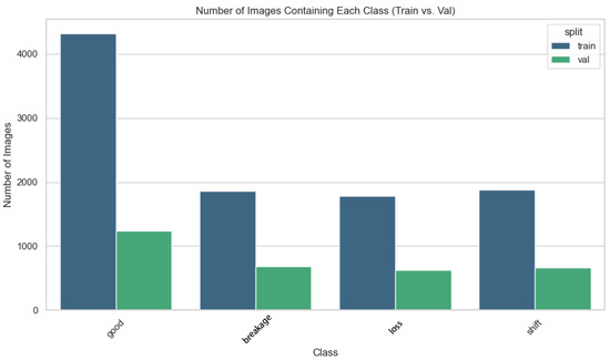 The dataset also suffers from severe class imbalance, which can impair the model’s ability to recognize minority classes. Figure 9 illustrates the class distribution, showing that the number of samples in the “good” category far exceeds those in the other three categories. This imbalance may lead to the inadequate recognition of minority classes such as “breakage”, “loss”, and “shift”. To address this issue, data augmentation and resampling strategies should be employed to balance the class distribution, ensuring that the model can effectively learn the features of all classes.