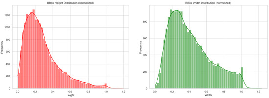 The dataset exhibits substantial scale variations, which pose a significant challenge for multi-scale feature detection. The normalized distribution of bounding box areas (Figure 7) indicates that small targets dominate, primarily concentrated in the 0.1–0.4 range. Specifically, the “breakage”, “loss”, and “shift” categories show large interquartile ranges and outliers, reflecting substantial variations in the spatial extent of “breakage”, “loss”, and “shift” defects. In contrast, the “good” category demonstrates more consistent size stability. The normalized distributions of bounding box height and width (Figure 8) further confirm these scale variations. Both height and width exhibit right-skewed distributions, with a few large-sized targets in the tail (e.g., significant variations in the aspect ratio of the “loss” category) contrasting sharply with the high-frequency small targets. These scale variations necessitate the enhancement of multi-scale feature pyramids and attention mechanisms to improve small-target detection and shape adaptability.