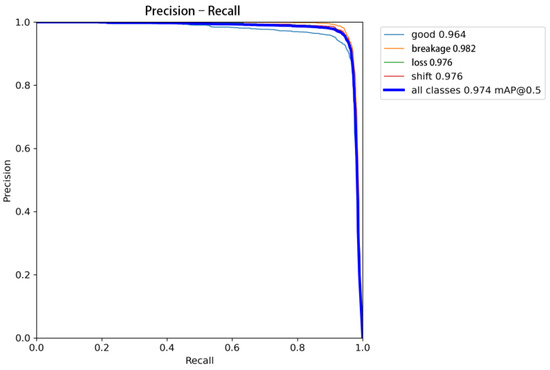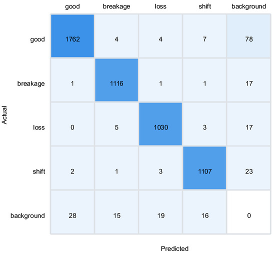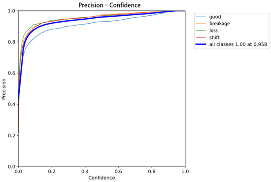 The confusion matrix analysis (Figure 15) provides a detailed breakdown of the model’s classification performance across different defect categories. The model achieved a classification accuracy exceeding 95% for all categories, with only minor cross-misjudgment (approximately 3.5%) observed between the “breakage” and “loss” classes. This cross-misjudgment is likely attributable to the similarity in some of their geometric and visual features, such as small cracks or deformations that may appear similar in certain lighting conditions. However, the overall high accuracy (98.6%) demonstrates that the model can effectively distinguish between different types of defects, even in complex scenarios with varying lighting conditions and background interference.