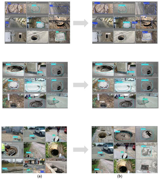To further visualize the model’s performance, Figure 16 compares the true labels and prediction results of the manhole cover defect images. The results show that the model can accurately identify and classify different types of defects, even in complex scenarios with varying lighting conditions and background interference. The high consistency between the true labels and prediction results confirms the model’s robustness and reliability for practical applications. This level of accuracy and generalization ability makes the proposed model highly suitable for real-time manhole cover defect detection in urban environments.