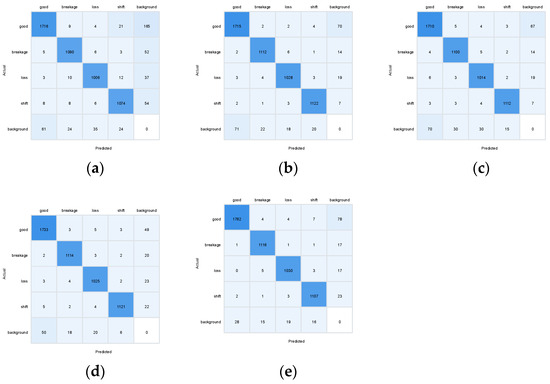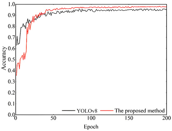 This study employed YOLOv8 as the baseline model and systematically validated the effectiveness of the proposed improvements through ablation experiments. Specifically, this paper conducted a comprehensive evaluation of the EfficientNetV2 backbone network, the Outlook Attention mechanism, and the NAS-FPN feature fusion module. Figure 17 illustrates the accuracy trends of the improved model compared to the original YOLOv8 during the training process. From the curves, it can be observed that the improved model (red line) exhibited faster convergence in the early stages of training and achieved significantly higher stable accuracy after the 50th epoch compared to the baseline model (black line). Through confusion matrix analysis (Figure 18a–e), it was found that the original YOLOv8 demonstrated accurate recognition of the “good” class (1736 instances) but suffered from false positives in defect detection. The introduction of EfficientNetV2 improved the recognition of the “good” class (1755 instances) and reduced false positives. The incorporation of Outlook Attention enhanced the detection of challenging defects, while NAS-FPN optimized inter-class discrimination. Ultimately, the combination of all three modules significantly improved the recognition accuracy for each class (1762, 1808, 1760, and 1787 instances, respectively) and reduced inter-class confusion, thereby validating the performance advantages of the improved model.