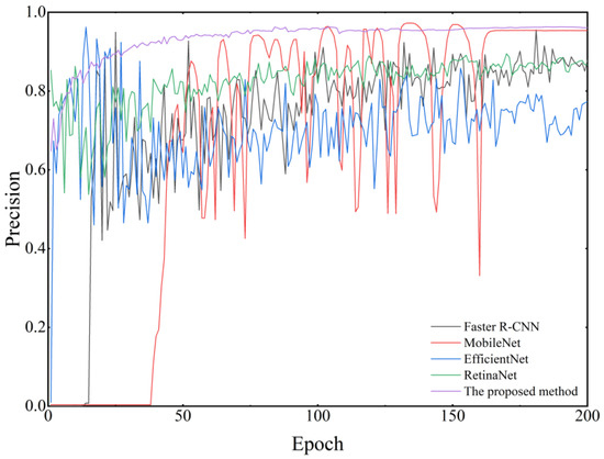To comprehensively evaluate the model’s performance, this study employed four metrics for quantitative analysis: accuracy, recall, F1-score, and precision. As shown in Table 3, when the EfficientNetV2 backbone network was introduced, the model’s accuracy increased by 1.1 percentage points (from 0.951 to 0.962). With the addition of the Outlook Attention module, the accuracy further improved by 1.92 percentage points (from 0.962 to 0.9812). When the NAS-FPN structure replaced the original feature fusion network, the accuracy increased by 1.6 percentage points compared to that of the baseline (from 0.951 to 0.967). These results fully demonstrate the effectiveness of each improvement module in enhancing model performance.