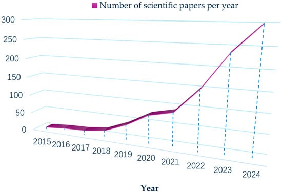 The relevant review of existing DN technologies focuses on grid-integrated photovoltaic systems [], service restoration solutions [], issues with distorted and weak power quality [], minimizing power losses [], and incipient fault detection []. There are relatively few reviews on multisource heterogeneous (MSH) data processing, and there has been no correlation review in areas such as temporary data preprocessing, MSH data fusion, or system state evaluation. This paper aims to supplement the review of such sensor data processing issues, which focuses on MSH data processing technologies for regional DNs that contain temporal data preprocessing, MSH data fusion, and system state evaluation, as quantified in Figure 1 through the number of scientific publications from 2015 to 2024. A comprehensive operational assessment requires not only DN operation data but also meteorological and hydrological information from the relevant regions. The multidimensional analysis is especially significant for effectively establishing renewable energy sources, which often come with inherent uncertainties. On the basis of investigating existing methods, we present the relevant MSH analysis methods and some conceptual frameworks for future DN system architecture. This review paper provides foundational insight for the processing and evaluation of regional DNs, particularly under extreme conditions. Finally, aiming at guiding technological evolution, this paper further outlines promising future research directions in sensor data processing.