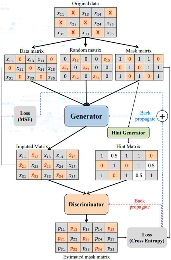 Data preprocessing poses significant challenges to the efficiency of predictive models and the reliability of subsequent decision-making. It may not only create analysis bias but also result in the loss of effective information. One may simply delete missing values, but this will cause changes in the distribution characteristics of the original sensor data, thereby affecting the completeness of the MSH analysis. MSH data preprocessing is primarily manifested in filling approaches, which can be divided into statistical filling, interpolation filling, filling approaches by combining multiple models, and artificial intelligence approaches. For instance, Wang et al. [] designed a short-term power prediction approach by data cleaning and feature reconstruction to enhance MSH prediction accuracy. The authors mapped many historical samples composed of wind direction, speed, and power into a multidimensional sample, and discussed the MSH data distribution and outlier detection in different dimensions using the local density of each sample. Gupta et al. [] established a bidirectional filling and prediction approach via a generative adversarial network (GAN), which adopted a custom generator loss function to fill missing data and a discriminator to compare the differences among observed values and filled ones. Liu et al. [] proposed a three-step data imputation approach, which sequentially imputed these missing values according to the principle of easy to difficult, and divided them into isolated missing values, continuous missing variables, and continuous missing samples. It was achieved through MSH fragment segmentation, interpolation, and estimation approaches, as well as a stepwise extrapolation prediction model via LSTM networks. Tang et al. [] proposed a super-resolution GAN-based interpolation to address the issue of coarse resolution in photovoltaic power generation and load consumption datasets. It provided 5 min photovoltaic and load power data from a 30 min/h temporal resolution. Yoon et al. [] designed a GAIN algorithm for handling missing data derived from GAN. Among its requirements for data, the integrity and quality of the data were the primary factors to consider for GAIN, as reemphasized in Figure 4. High-quality data could not only enhance the training efficiency of GAIN but also promote its generalization ability.