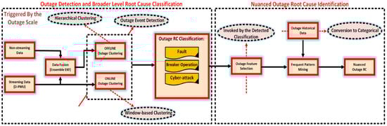 In addition, to address the problem of monitoring the DNs’ operation under an unknown distribution of sensor noise and measurement errors, Li et al. [] provided a dynamic state estimation approach by using adaptive set membership filters. Zhu et al. [] proposed a high-resolution state estimation framework for interval dynamic harmonics in DNs in line with MSH measurement fusion. It involved a selection strategy for the measurement location of harmonic electrical distance in DN power quality, an MSH data fusion with an exponential period, enhanced prediction correction, etc. In order to balance the information degradation induced by the errors from MSH measurement, quantization, and transmission, Seneviratne et al. [] devised a statistical fusion approach that was applicable not only to sensor networks based on structural chains and trees, but also to unstructured bidirectional graph noise in harsh environments. On the basis of YOLOv5 architecture, Niu et al. [] modified the GhostNet to reconstruct its original backbone network, which introduced a bidirectional feature pyramid structure for feature fusion and employed focal extended IoU to achieve the accuracy–speed balance. Yuan et al. [] employed Bayesian networks to search for power outages in MSH distribution systems, and leveraged probability graphs to involve MSH evidence and the complex structure of DN systems. This could improve the efficiency of interruption location inference in high-dimensional spaces. As shown in Figure 5, Gholami et al. [] designed an outage root cause analysis tool, which exploited the available data from many sensors within the DNs to (1) integrate via the MSH data fusion approach, (2) categorize events in a wider range by online- and offline-based hierarchical agglomerative clustering, and (3) take historical samples and frequent pattern growth mining approaches for subtle distinction detection.