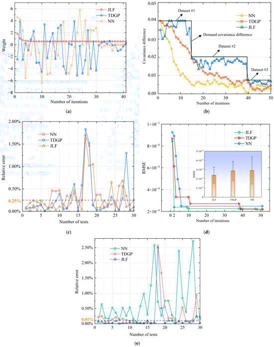 Examples of measured data fusion and processing. (a) Iterative curves of three algorithm weights in voltage data fusion. (b) Comparison of results of demand covariance of power under different data types and tracking covariance of three methods. (c) Comparison of results of relative errors in solar panel voltage. (d) Comparison of results of root mean square error of three methods for generating power. (e) Fusion error of power generation data.