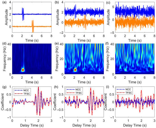 Comparison of the NCC method and TFSC method under different noise levels. (a–c) Simulated template signals (blue lines) and time-shifted target signals (orange lines) at SNR levels of 30 dB, 10 dB, and 0 dB, respectively. (d–f) Normal time–frequency amplitude spectra of the template signals (blue lines in a–c) at different SNR levels. (g–i) Comparison of similarity coefficients and estimated delays calculated by the NCC and TFSC methods under different SNR conditions.