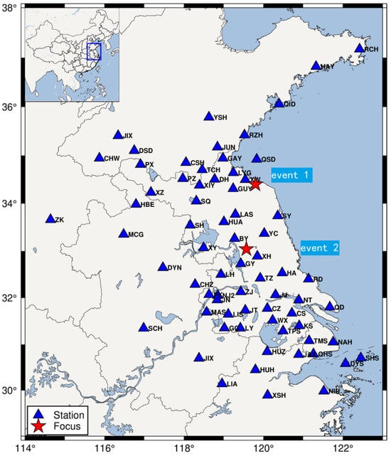 To verify the accuracy and reliability of the TFSC method, we collected waveform records from 70 seismic stations across different seismic networks for the P-wave first-motion polarity extraction study, as shown in Figure 2. Seismic Event 1 is a magnitude 3.5 earthquake that occurred on 19 January 2013, in Xiangshui County, Jiangsu Province (epicenter: 34.4° N, 119.8° E), with a focal depth of 5 km. The average distance between stations near Seismic Event 1 is 52.21 km, and the closest station is 26.05 km from the event. Seismic waveform records are subject to varying levels of environmental noise interference. Therefore, the waveform data from stations closest to the seismic event are more reliable for constraining the epicenter location. Seismic Event 2 is a magnitude 4.9 earthquake that occurred on 20 July 2012, in Gaoyou, Jiangsu Province (epicenter: 33.04° N, 119.57° E), with a focal depth of 15 km. This event is associated with a branch fault of the Tan-Lu fault zone (not the main fault). The average distance between stations near Seismic Event 2 is 61.84 km, with the closest station 30.83 km from the event. According to the Global CMT solution, the seismic source mechanism of Event 2 has a strike of 22°, a dip angle of 73°, and a rake angle of 177° (https://www.globalcmt.org/CMTsearch.html, accessed on 30 May 2025).