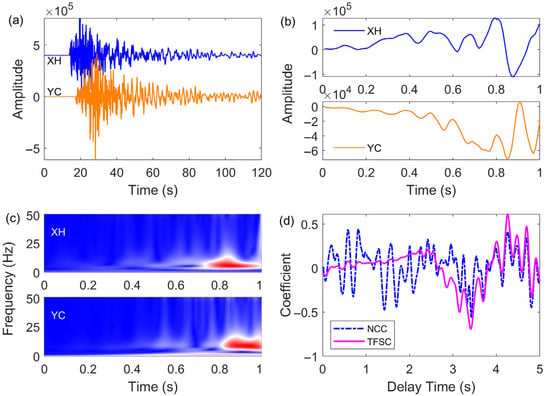 For a fair comparison, both the TFSC and NCC methods adopted the same sliding window parameter. In both approaches, a 1 s waveform segment following the P-wave arrival was selected as the template signal. The maximum absolute value of the similarity coefficient indicates the best match between two signals, and the corresponding time delay represents the P-wave arrival time difference. Figure 3 presents a comparison of the delay and similarity coefficients computed by TFSC and NCC for the earthquake signals. The waveform segment within 1 s after the P-wave arrival at station XH was selected as the template (Figure 3a) and matched against the signal at station YC. The waveform comparison between the NCC template and target signal is shown in Figure 3b. The TFSC method, in contrast, uses NTFT to transform the signals, and matching is performed using the corresponding time–frequency spectral coefficients (Figure 3c). Figure 3d shows the similarity coefficient series obtained from both methods. When the P-wave first-motion polarities of the template and target signals are opposite, the resulting similarity coefficient is negative. The manually determined P-wave arrival time difference between XH and YC is 3.38 s. The NCC method yields a maximum absolute similarity coefficient of 0.556 (with opposite polarity, −0.556) and a delay of 3.42 s. The TFSC method gives a maximum absolute similarity coefficient of 0.694 (with opposite polarity, −0.694) and a delay of 3.41 s. The peak feature in the TFSC result is more distinct and easier to identify. Compared to the time-domain NCC cross-correlation method, the time–frequency domain TFSC method provides more stable and accurate matching of the target signal.