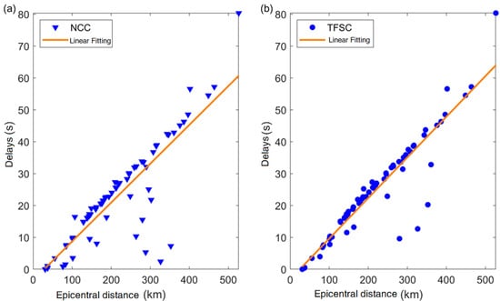 Comparison of time delays calculated by the NCC and TFSC methods. (a) Time delays estimated by the NCC method plotted against epicentral distance. (b) Time delays estimated by the TFSC method plotted against epicentral distance, showing fewer outliers.