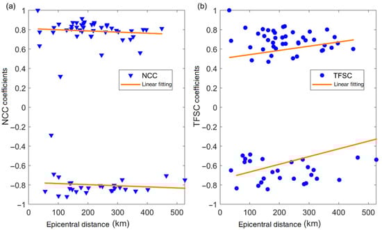 Comparison of similarity coefficients calculated using the NCC and TFSC methods. (a) Similarity coefficients calculated by the NCC method versus epicentral distance. (b) Similarity coefficients calculated by the TFSC method versus epicentral distance. The TFSC method is more sensitive to structural variations in the signal.