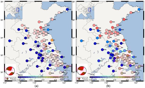 Furthermore, the variation in similarity coefficients calculated by the NCC and TFSC methods with the station distribution is analyzed, as shown in Figure 6. In the figure, positive values of similarity coefficients indicate positive P-wave first-motion polarity, while negative values indicate negative polarity. The Ms 4.9 earthquake in Gaoyou, Jiangsu Province, was a strike-slip event along the Chuhe Fault, with a strike orientation of either north-northeast or northwest. The Chuhe Fault, located near the epicenter, trends north-northeast and extends across Jiangsu and Anhui Provinces to the Yellow Sea. The region is seismically active, with significant tectonic movements caused by the ongoing compressional forces from the Tethys and enhanced Pacific tectonics. The eastern part of China exhibits NE-striking sinistral shear movements, particularly along the Tan-Lu fault zone [27]. As shown in the source sphere from the Global CMT solution in Figure 6, the P-wave first-motion polarity results calculated using both the NCC and TFSC methods show a quadrant distribution that is consistent with the strike-slip mechanism derived from the Global CMT solution. The negative and positive correlations calculated by the NCC method reflect the correlation between signals, with strong correlations and small variations in the coefficient values. The positive and negative coefficients calculated by the TFSC method reflect the similarity between signals, with a more diverse distribution of coefficient values. This indicates that the TFSC method is more sensitive to structural changes in the seismic signal.