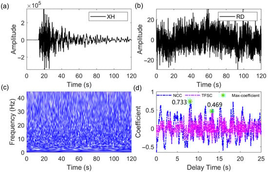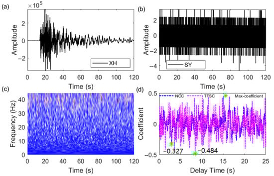 Strong noise interference signal identified by the NCC and TFSC methods. (a) Template signal. (b) Target signal to be matched. (c) NTFT time–frequency amplitude spectrum corresponding to (b), used to assess whether the signal contains earthquake characteristics. (d) The similarity coefficients and delay variations computed by the NCC and TFSC methods through (a,b). The green ‘*’ in the figure represents the maximum value of the absolute similarity coefficient, corresponding to the delay between the two signals.
