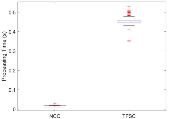 Furthermore, the computational complexity of the proposed TFSC algorithm was compared with that of the NCC algorithm, and the comparison results are shown in Table 2. All experiments were conducted on a laptop equipped with an Intel Core i7-10750H CPU @ 2.60 GHz, 64 GB RAM, and an NVIDIA GeForce GTX 2060 GPU. We evaluated the processing time required by the TFSC and NCC methods on 210 seismic signals recorded from 70 seismic stations. As shown in Figure 9, the experimental results indicate that the TFSC method takes approximately 0.44 s on average to process a single seismic signal. Compared to the NCC algorithm, the improved accuracy of the TFSC method comes at the expense of reduced computational efficiency. According to the convolution theorem, there is still room for optimizing the computational complexity of the TFSC method. Optimizing the algorithmic structure or deploying the method in a higher-performance computing environment is expected to further reduce the required computation time.