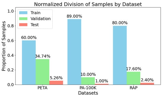 Dataset partitioning. Division of the PETA, PA-100K, and RAP datasets into training, validation, and test subsets. Each dataset used a fixed test size of 1000 images to maintain evaluation consistency.