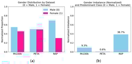 Gender distribution and imbalance visualization. (a): stacked bar plots showing the proportion of male vs. female samples in each dataset. (b): bar chart of absolute gender imbalance percentages. RAP exhibits strong male bias, while PETA is close to parity.