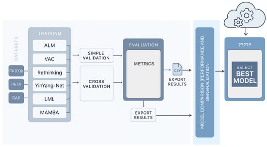 All models were implemented using the PyTorch framework and trained on two local GPUs: an NVIDIA RTX 4060 (8 GB) and a ZOTAC RTX 2080 (11 GB). The dataset splits defined in the PETA, PA-100K, and RAP benchmarks (NVIDIA Corporation, Santa Clara, CA, USA, ZOTAC Technology Limited, Fo Tan, New Territories, Hong Kong)—as presented in Table 1 in Section 3.1—were strictly preserved to ensure consistency across all experiments. Each model was trained independently for all nine train–test combinations defined by the cross-domain evaluation protocol, resulting in a total of 54 valid and systematically comparable configurations (). Fixed random seeds were used to guarantee reproducibility. On average, training each model per evaluation scenario required approximately 27 h, with total runs exceeding 100 to accommodate tuning and robustness checks. Input images were normalized and resized based on the input requirements of each model for convolutional networks (e.g., ResNet-50) and for transformer-based architectures (e.g., Swin Transformer). Additional training details, such as optimizer configuration, loss function, and early stopping strategy, are documented in Section 3 and the training hyperparameters used across all experiments are summarized in Table 5.