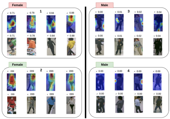 Saliency patterns. Across all architectures, the salient regions for male subjects concentrated on the head–torso silhouette, as well as posture cues. Female subjects were likewise identified through body outline, yet an additional reliance on hair length and apparel was evident, especially in LML and YinYang-Net. Images containing short-haired women, neutral or traditionally ’masculine’ clothing, or low-key illumination mislead the models; Grad-CAM maps show the attention shifting from the face to the outline of backpacks or broad hand gestures, confirming a bias towards accessory context rather than inherent morphological traits.