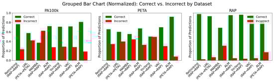 This figure is organized by dataset (PA100k, PETA, and RAP), providing a clear view of each model’s performance across different domains. Green bars represent correct classifications, while red bars indicate errors. Each subplot groups models based on their proportions of correct and incorrect predictions during testing, facilitating both intra- and cross-domain analysis. Notably, the RAP dataset demonstrated greater overall robustness, with the ALM model achieving the lowest error rate. In contrast, the PA100k and PETA datasets exhibited higher performance variability and error rates, highlighting the generalization challenges posed by domain shift.