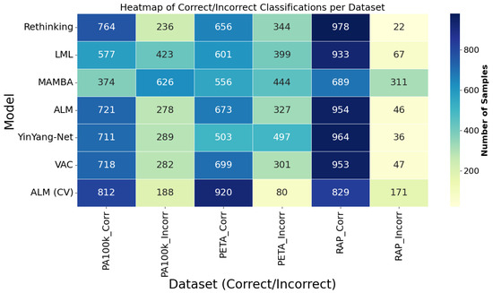 This figure presents a heatmap that provides a consolidated view focused on the models. Each row corresponds to a model, and the columns indicate the number of correct and incorrect predictions in each dataset. The color intensity allows for quick identification of models that stood out in performance. The ALM model, especially in the cross-validation (CV) version, stood out with the highest values of correct classifications and the lowest error rates, particularly on the PA100k and PETA datasets. This representation is especially useful for recognizing performance patterns and assessing the consistency of each model across different domains.