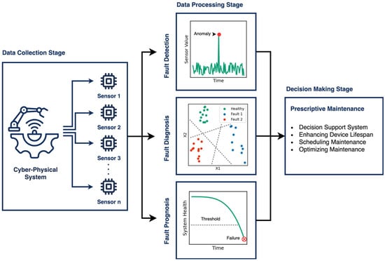 Figure 1 presents a typical flow diagram of a PHM framework for CPS. The process begins with data acquisition, where sensors collect operational data from the system. This raw data is then processed to support objectives such as fault detection, diagnosis, or prognosis, depending on the system’s specific requirements and the availability of data. Fault detection involves identifying anomalies or failures, whereas fault diagnosis extends this process by localizing, classifying, and assessing the nature and severity of the detected faults. Fault prognosis, on the other hand, aims to predict the timing and location of potential failures, often by estimating the system’s future condition or the remaining useful life (RUL) of its components [7,8,9]. Building on these insights, prescriptive maintenance offers a more advanced, data-driven approach by recommending targeted actions to maintain or restore optimal system performance. It goes beyond prediction to support informed decision-making, enhance operational efficiency, and drive greater business value through strategic maintenance planning [10,11].