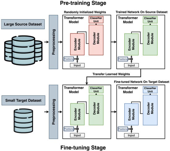 Figure 2 illustrates the proposed transfer learning framework, which utilizes a transformer-based architecture to enable effective knowledge transfer from a large-scale source domain to a smaller, domain-specific target domain. In this study, the DL model is initially pre-trained on a large-scale source dataset until it achieves optimal performance. Subsequently, the model is fine-tuned and validated on the target dataset using K-fold cross-validation to mitigate overfitting and reduce bias. As depicted, the model begins with randomly initialized weights (indicated in red), which are updated during the pre-training phase. These trained weights (shown in green) serve as the starting point for the fine-tuning stage, during which they are further adjusted until convergence (shown in blue). This process enables the model to use knowledge from the source domain to improve performance on the target dataset, which contains limited labeled data. The transformer architecture is chosen for its strong ability to capture temporal dependencies and detect patterns in sequential data.