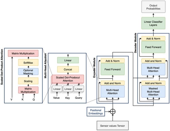 At the core of the transformer model is the attention mechanism, which enables the model to identify meaningful patterns in sequential sensor data [35]. Specifically, the attention layer computes three distinct, learned representations of the input tensor via linear transformations: the query (), which specifies what we are searching for; the key (), which indicates what information is available; and the value (), which contains the content to be retrieved. These projections are mathematically defined in Equation (3):