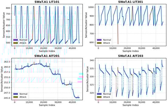 Four sampled sensor readings from the SWaT.A1 dataset under normal (blue) and attack (red) conditions.