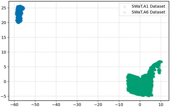 Although both datasets originate from the same CPS system, they were collected under different operating conditions and recorded four years apart. Figure 5 shows a 2D visualization of the datasets using PCA after normalization. Each point represents a row in the respective datasets, forming two distinct clusters that highlight the variation in data distributions. The clear difference in probability densities shows the presence of a domain shift, which validates the suitability of a transfer learning approach. Given its limited size, the SWaT.A6 dataset alone is insufficient to train complex DL models such as transformer architectures. Therefore, this study uses a transfer learning strategy: the model is first pre-trained on the larger SWaT.A1 dataset and subsequently fine-tuned using the smaller SWaT.A6 dataset to enhance performance under data-constrained conditions.