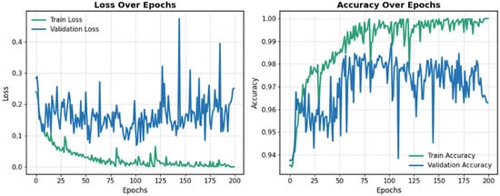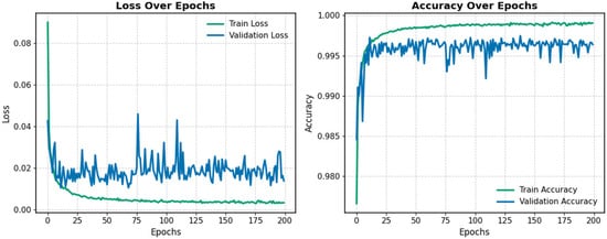 In the final stage, the output tensors produced by the decoder are passed through a series of FC layers, interleaved with Rectified Linear Unit (ReLU) activation functions. The classification head receives input vectors of dimension , and the final output layer produces a probability distribution over the target classes. Model training is performed using the cross-entropy loss function, which is optimized via the gradient descent algorithm.