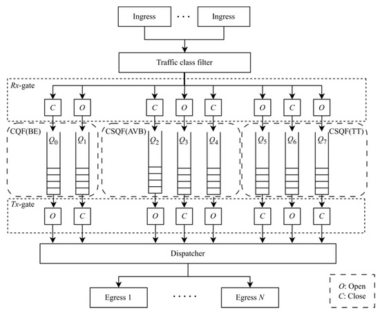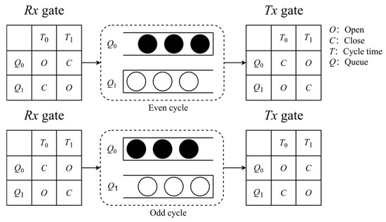 CQF employs a ping-pong queue model [23] to schedule traffic, ensuring deterministic delay communication. As depicted in Figure 1, the original CQF model utilizes two queues, denoted as Q0 and Q1. Figure 1 assumes two time intervals, T0 and T1, within one time cycle. The receiving gate (Rx) and transmitting gate (Tx) control the queue reception or transmission of flows. When the Rx or Tx gate is open (O), the associated queue can receive or transmit flows. Conversely, when the Rx or Tx gate is closed (C), the associated queue prohibits the reception or transmission of flows. For instance, during the odd time slot within interval T0, Q0 opens its Rx gate to receive traffic, while Q1 opens its Tx gate to transmit traffic. Conversely, during the even interval T1, the operations are reversed, cyclically alternating the transmission states of the two queues.