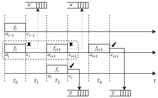 For each frame i, assume that ai denotes the arrival time of the ith frame, ci represents the completion time of the ith frame, Q denotes the queue, and W represents the waiting queue. For i, if ai > ci−1, it indicates that the current i can immediately begin execution since its arrival time exceeds the completion time of the previous frame. At this point, we assign i to an available Q for transmission, as illustrated by the solid box between fi and fi+1, or if all queues are busy, it is placed in W, as depicted by the dashed box between fi and fi+1. If ai < ci−1, it indicates that the current i needs to wait for the previous frame task to be completed. Subsequently, i is added to W, where frames in the waiting queue will resume processing after the completion of the preceding frame task, as illustrated in Figure 4.