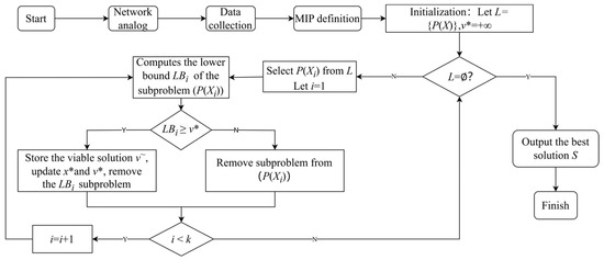The feasible region of variables is partitioned into two or more sub-problems, dividing the search space into disjoint subspaces. Subsequently, each sub-problem is addressed individually. Following the branching, the solver handles the segregated sub-problems, each of which constitutes an independent optimization problem. These sub-problems are a linear programming problem, employing the objective function and constraints of the original problem along with additional branching constraints such as variable bounds. The solver endeavors to solve each sub-problem to identify the optimal solution or enhance the lower bound (LB), progressively narrowing down the search space. The next step involves determining the upper bound (UB) and the lower bound (LB), where the UB is an estimate of the known optimal solution, usually initialized as positive infinity. The LB represents the current best estimate of the optimal solution. Our objective is to gradually diminish the LB to approach the UB (branch-and-bound). When the LB sufficiently approximates the UB, the algorithm can terminate, indicating that the optimal solution has been found. Pruning is a pivotal component of the branch-and-bound algorithm. If during the sub-problem solving it is observed that the LB exceeds the current UB, the sub-problem can be pruned, ceasing further exploration. This is because a superior solution is deemed unattainable in this sub-problem, thus it can be safely disregarded, reducing the search space. Pruning operations can significantly enhance the efficiency of the algorithm. The specific procedural diagram is depicted in Figure 5.