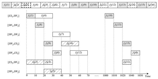In the context of the GA, the solution to scheduling optimization problems is represented as chromosomes composed of genes. The optimal chromosome for problem-solving is identified through operations such as evolution and mutation. Chromosomes comprise frames represented as genes, with each frame initially generated using queuing theory. In Gantt charts, frames are placed on source-to-destination paths according to the sequence of frames on the chromosome, thereby generating a timeline. When a frame is scheduled on a particular path, scheduling on the next path should commence from the completion time of transmission on the preceding path. By iteratively following this approach, the timelines for all genes in the chromosome can be generated. As shown in Figure 6, a chromosome is composed of four different types of traffic spliced into frames. For example, since f1(1) is the initial frame in Figure 6 (the numbers in parentheses represent the serial number in the chromosome, and the subscripts represent which traffic its frame belongs to), it is positioned on [ES1, SW1] following the route specified in Table 1. As an example of frame properties, f4(2), indicated as the second gene, is placed on [ES2, SW3]. Similarly, f3(3) as the third gene is placed on the same link. Table 1 provides an example of transmission cycles, transmission delays, and routing in the network.