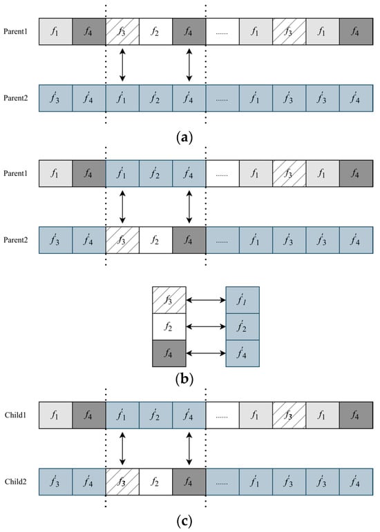 Figure 7 illustrates an instance of the PMX operation. This operation preserves the positions of a specific number of genes in the chromosome. A pair of chromosomes, fn and f′n (parents), are randomly selected from the current generation, and three gene segments with identical start and end positions are chosen, as depicted in Figure 7a. These two segments are then swapped, as shown in Figure 7b. Subsequently, conflict detection is performed to establish a mapping between the exchanged gene segments, as illustrated in Figure 7c. Through this mapping, the formation of new pairs of offspring genes is ensured to be conflict-free. PMX guarantees that the generated offspring chromosomes do not exhibit duplicate or missing genes, thereby facilitating the rational selection of traffic paths. By employing partial matching, the offspring chromosomes encompass complete genetic information from both parents, ensuring the diversity and integrity of traffic path selection in the TSN network.