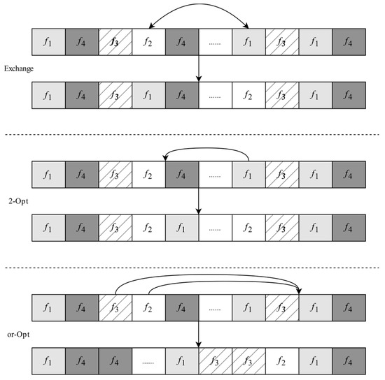 As shown in Figure 8, three types of operators designed for variable neighborhood search are exchanged, 2-Opt and or-Opt, respectively. Here, three operators are applied sequentially. The exchange operator randomly selects two different frames from the current solution and exchanges their positions. The 2-Opt operator randomly selects two different frames, such as f1 and f2, and reverses the order of the nodes after frame f2. The or-Opt operator randomly selects two consecutive nodes, such as f2 and f3, and reverses their order, inserting them after a randomly selected node, f3. Set the initial domain structure, select the first domain operation (exchange operator), and search locally in the current domain structure. If the solution found in the current neighborhood is better than the current solution, then accept the solution, and go to the next neighborhood operations (2-Opt the and or-Opt operator) until no better solution is found in all the neighborhood structures or the predefined condition is satisfied.