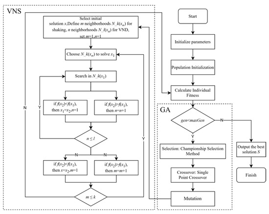 The genetic component in the VNS-GA utilizes population evolution to globally explore the solution space, while the variable neighborhood search continually adjusts the neighborhood of solutions for local exploration, aiming to identify superior solutions. By synergistically employing these two strategies, the VNS-GA achieves an optimal balance between global and local search, facilitating the rapid discovery of high-quality solutions. The specific process is illustrated in Figure 9.