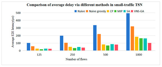 We conducted comparisons of the performances of CP and MIP in Multi-CQF across different traffic TSN networks, as well as the capability of heuristic algorithms to find high-quality solutions. As depicted in Figure 11, the results indicate that the proposed MIP algorithm reduces an average delay by approximately 76% and 58% compared to Naive and Naive greedy, respectively. In contrast to the CP formula, the MIP algorithm exhibits significant scheduling advantages in small-traffic networks, enabling the identification of global optimal solutions, resulting in an average latency reduction of approximately 13.33%. However, as the TSN network scales up, with the number of flows exceeding one thousand, the MIP algorithm is outperformed by the SA and VNS-GA. This is due to the escalating complexity of the problem in large-traffic networks, which may result in exceedingly long solution times for MIP algorithms and a higher likelihood of becoming trapped in local optima. Conversely, heuristic algorithms boast lower computational complexity, enabling faster approximation to optimal solutions.