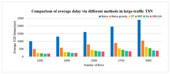As anticipated, heuristic algorithms consistently achieve superior delay performance with the increase in flow volume. Large-traffic networks typically comprise numerous nodes and edges, rendering exact methods such as MIP computationally prohibitive. In such scenarios, heuristic algorithms often present a more viable alternative. In comparison to Naive, Naive greedy, CP, and MIP approaches, both SA and the VNS-GA yield commendable optimization outcomes. With combining diverse search strategies, the proposed VNS-GA method facilitates a more comprehensive exploration of the solution space, thus converging to near-optimal solutions more expediently. Consequently, the proposed method outperforms SA by approximately 7.44% and demonstrates notable robustness in large-traffic TSN networks. Simulation findings are depicted in Figure 12.